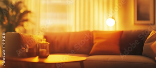 Cozy blurred living room interior with warm lighting perfect for interior design background use in residential projects