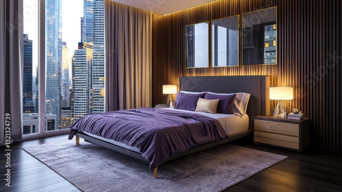 Cozy brutalist bedroom, dark textured walls, lavender satin bedding, bedside tables, warm lighting, plush curtains, skyline view