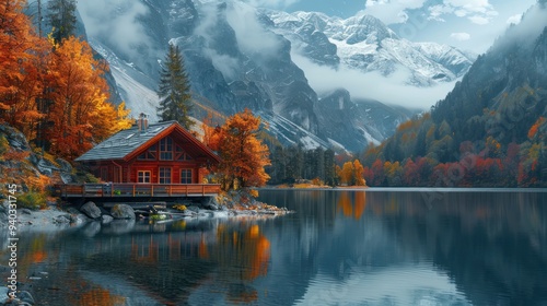 Cozy cabin by a serene lake surrounded by autumn foliage with snow-capped mountains in the background.