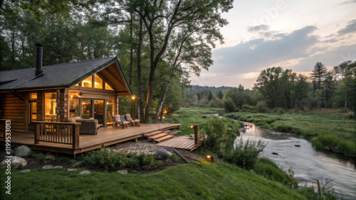 Cozy cabin by tranquil river in lush forest setting at dusk