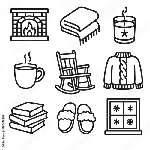 Cozy Cabin Essentials. Line style icons of Cozy Cabin Hygge: crackling fireplace, wool blanket, scented candle, steaming cocoa mug
