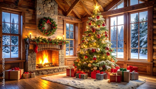 Cozy cabin interior decorated for Christmas with a lit tree and gifts