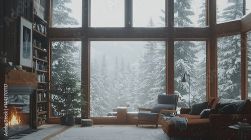 Cozy cabin living room with large windows overlooking snowy forest during winter snowfall. Perfect for winter holiday themed content