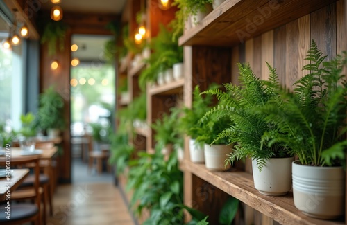 Cozy cafe interior with biophilic design. Wooden shelves with plants. Green plants, natural light. Concept of nature integration in interior space. Modern eco-friendly, sustainable cafe. Well-being,