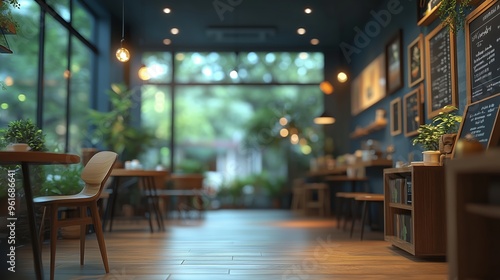 Cozy café interior with wooden furnishings and greenery, showcasing a tranquil ambiance during the daytime