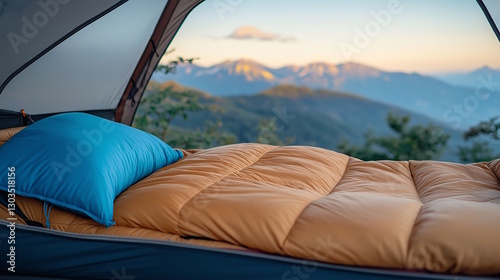 Cozy camping retreat: inviting sleeping bag in tent with mountain views for outdoor adventure