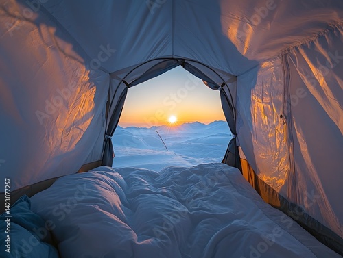 Cozy Camping Tent at Sunrise: Tranquil Wilderness Adventure and Spectacular Mountain View Photography