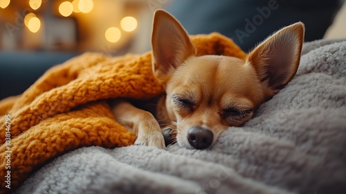 Cozy Chihuahua Curled Up on Plush Blanket for Lazy Movie Night at Home