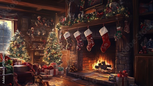 Cozy Christmas Cabin Fireplace Scene With Presents And Trees