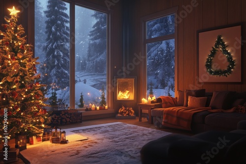 Cozy Christmas Cabin Interior with Fireplace and Snowy View
