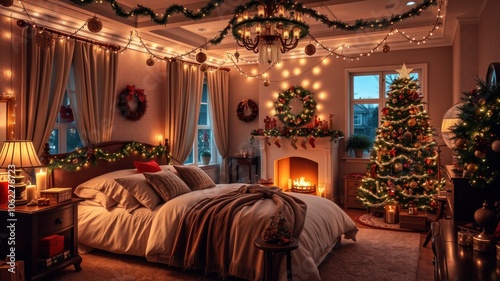 Cozy Christmas Decorated Bedroom Interior for Urban Exploration Photography - Happy New Year Concept