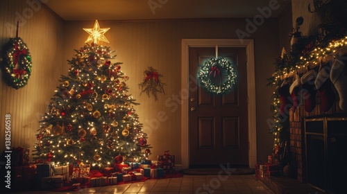 cozy christmas home interior with decorated tree and fireplace