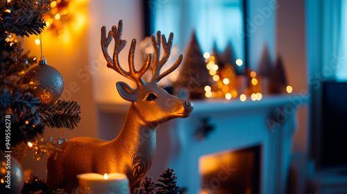 Cozy Christmas Interior with Wooden Reindeer Decoration and Warm Festive Lights