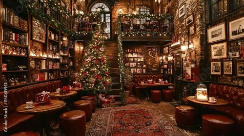 Cozy Christmas Pub Interior with Bookshelves and Decorated Tree