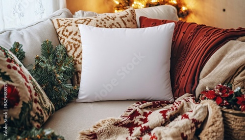Cozy Christmas Scene Featuring a Blank Throw Pillow on a Comfortable Couch Perfect for Holiday Mockup Display