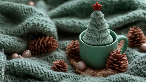 Cozy Christmas scene knitted tree in mug, pine cones, blanket.