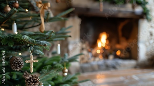 Cozy Christmas scene with a decorated tree and a warm fireplace in the background, perfect for holiday celebrations and winter warmth.