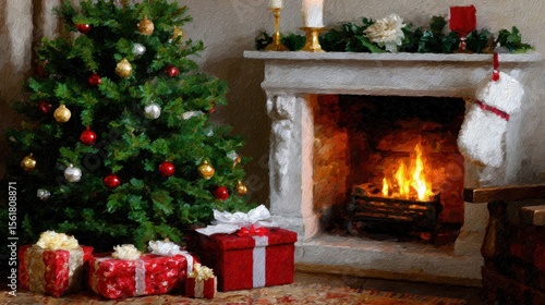 Cozy Christmas scene with a decorated tree, gifts, and a lit fireplace adorned with stockings and candles in a warm, festive living room.