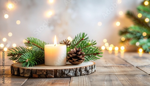 Cozy Christmas scene with candle and pine on wooden stump
