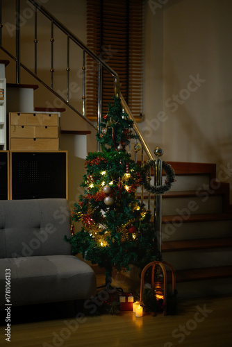 Cozy Christmas Tree with Glowing Lights in living room Interior with grey Sofa and Staircase Beside
