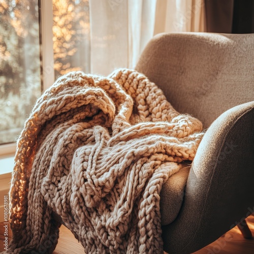 Cozy chunky knit blanket draped over armchair in sunlight, creating warm winter atmosphere