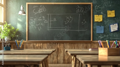 Cozy Classroom with Wooden Desks and Chalkboard Featuring Mathematical Equations and Colorful Sticky Notes