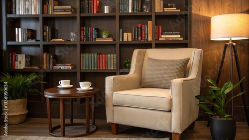 Cozy Coffee Corner with Chair and Bookshelf for Relaxing Reading Time in Home Library