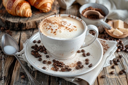Cozy coffee setup with a white ceramic cup, croissants, and coffee beans on rustic table