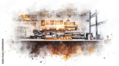 Cozy coffee shop with colorful pastries on display, warm ambiance, inviting interior design, watercolor style accentuating charm