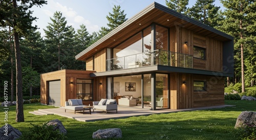 Cozy contemporary house surrounded by serene forest in a tranquil setting with warm sunlight filtering through trees