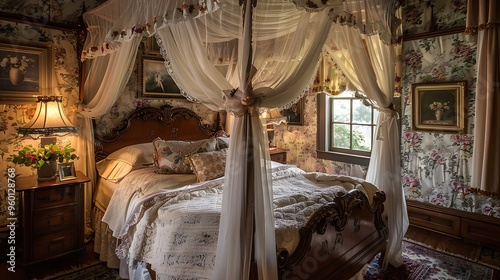 Cozy cottage bedroom with warm lighting and charming rustic decor.