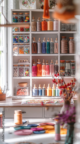 Cozy craft studio yarn threads colorful supplies creative workspace handmade project warm light for crafter blogger artist wallpaper background