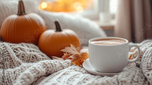Cozy cup of coffee with pumpkins in autumn light