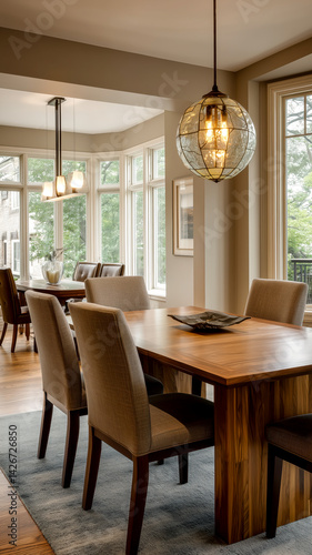Cozy dining room with natural light, stylish lighting fixtures, wooden table, and neutral color scheme.