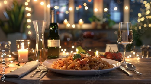 Cozy Dinner Table Setting Delicious Pasta Dish Served in Soft Evening Light