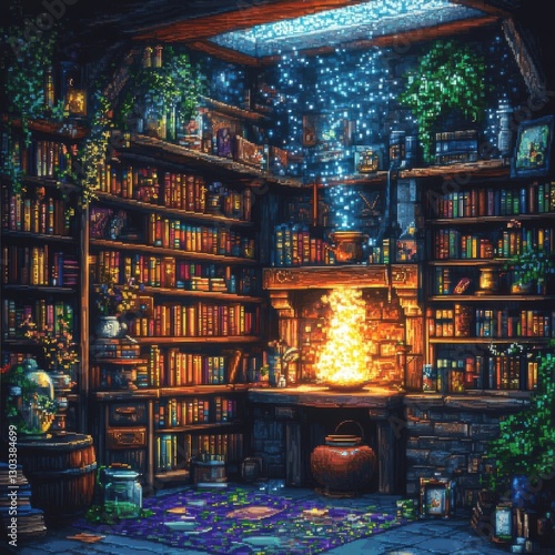 Cozy Enchanted Library with Flickering Firelight and Magical Decor