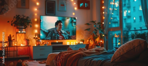 Cozy Evening Watching Comedy Show at Home with Warm Lighting and Relaxing Atmosphere
