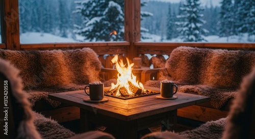 Cozy Fireplace on Cabin Deck with Marshmallow Drinks in Winter
