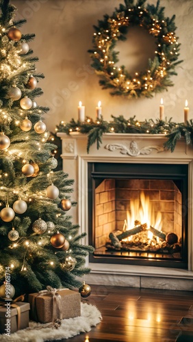 Cozy Fireplace with Pine Cones and Candlelight Christmas Decorations