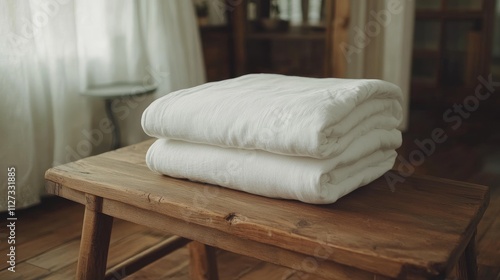 Cozy folded white blanket and pillow on rustic wooden bench in serene bedroom setting