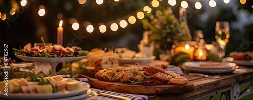 Cozy Fourth of July dinner table adorned with patriotic decorations, themed centerpieces, and sun flare highlighting the festive atmosphere
