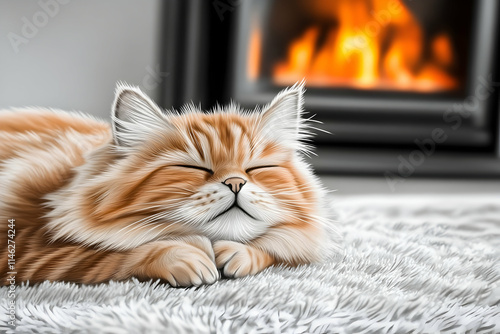 Cozy ginger cat napping on fluffy rug by fireplace.