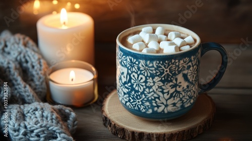 Cozy handmade ceramic mug of hot chocolate with marshmallows on rustic wooden surface, enhanced by knit scarf and candlelight ambiance