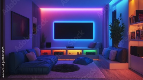 Cozy home cinema: LED-lit nook with beanbag and modern art