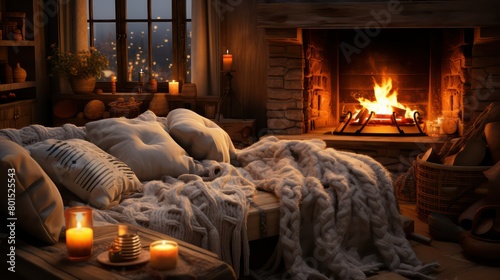 Cozy home interior with burning fireplace and cozy pillows.