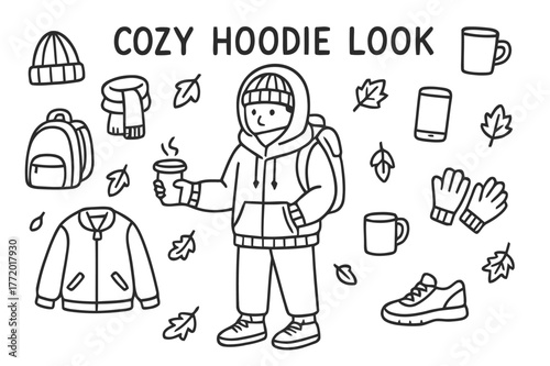 Cozy Hoodie Doodle. Cozy Hoodie Look. Hand-drawn doodle illustration Cozy Hoodie Look hoodie, hood, zipper, pocket, person wearing hoodie, gloves, scarf,