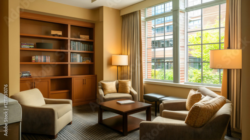 Cozy hotel library lounge with large window, bookshelves, and comfortable seating. Ideal for relaxation and reading