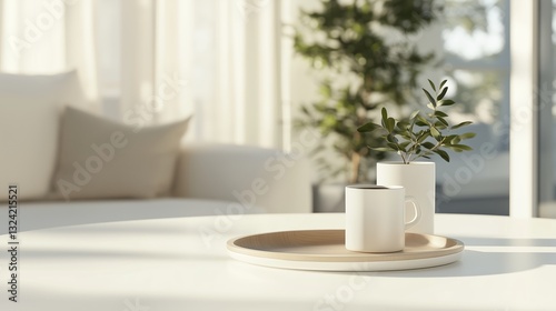 Cozy indoor space featuring a minimalist decor with a coffee cup and a small plant on a wooden tray