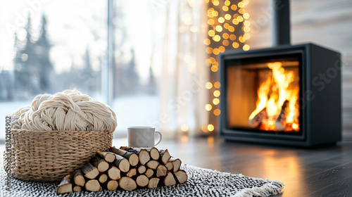 Cozy indoor winter scene with burning fireplace and wool basket still life near window lighting
