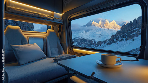 Cozy interior of a modern camper van featuring scenic mountain view, soft lighting, and a cup of coffee on the table